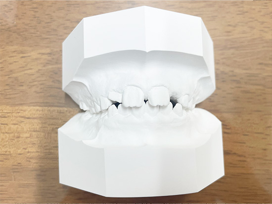 検査結果のデータと歯型の模型をまじまじ見比べてみると、上顎を広げないと歯が収まりきらないのがなんとなくわかりました。実際には、固定式の拡大装置で上顎の幅を6mm広げるようです。