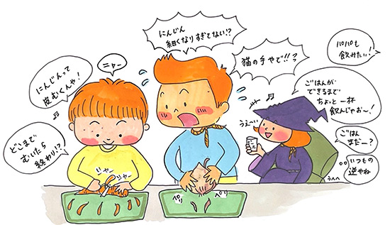 分担ではなく、それぞれに野菜の皮をむいてもらったり、包丁で切ってもらったりしました。すべての工程をしてもらうことで、お料理の楽しさや大変さがわかるかなと思ったからです。長男は調理実習が学校であったので、一度見本を見せると器用にこなしていました。次男ははじめてだったので、包丁の猫の手から教えましたよ。