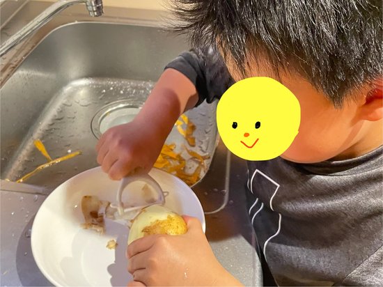 はじめてのピーラーでどんどん皮をむく次男