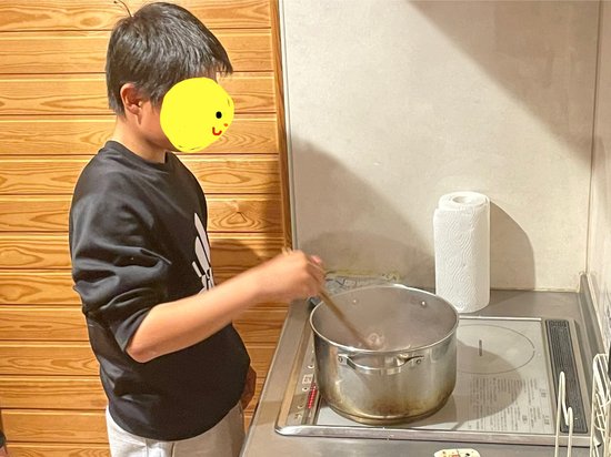 包丁を使い終わり、次はお鍋で調理です。ここまでくると次男はクッキングに飽きてしまい、ゴロゴロしはじめたので長男が炒めてくれました。