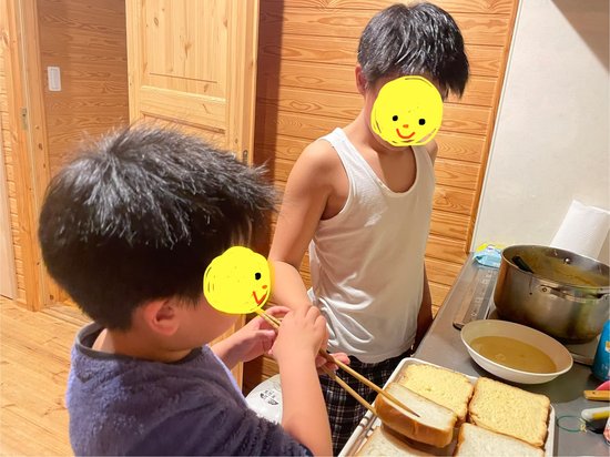 動けるくらいに時間が経った後で、翌日のフレンチトーストの仕込みをしてもらいました。パパ直伝の味付けだそうです。要するに目分量⁈