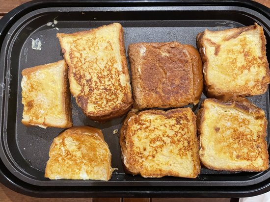 翌朝、冷蔵庫でたまご液に一晩つけたトーストを長男がホットプレートで焼いてくれました。おいしそうな見た目でしたが、お味は甘さ控えめでした。シロップをひたひたにして食べたかったかな。もしくは、もう少し砂糖を多めにといったところでしょうか。